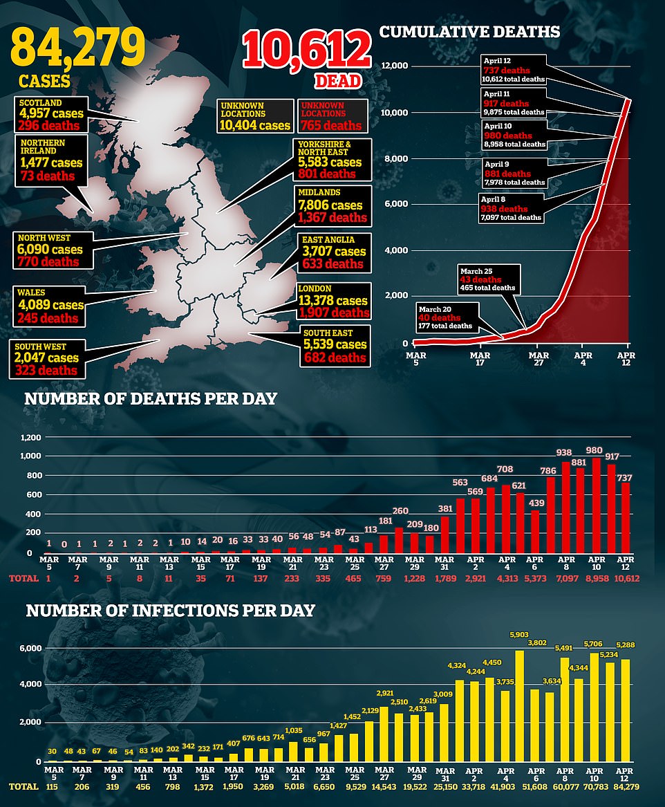 Britain's spiralling death toll hit 10,000 today with 737 new fatalities.