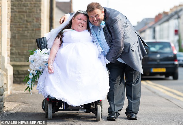 The pair got married at St Mary’s Church in Cardiff in front of 80 friends and family. Determined Alicia made her way down the aisle in her motorised wheelchair.
