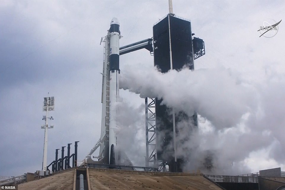 - NASA astronauts Robert Behnken and Douglas Hurley were strapped in the Crew Dragon capsule when the announcement was made with just 16 minutes and 54 seconds left on the clock until the rocket was to takeoff