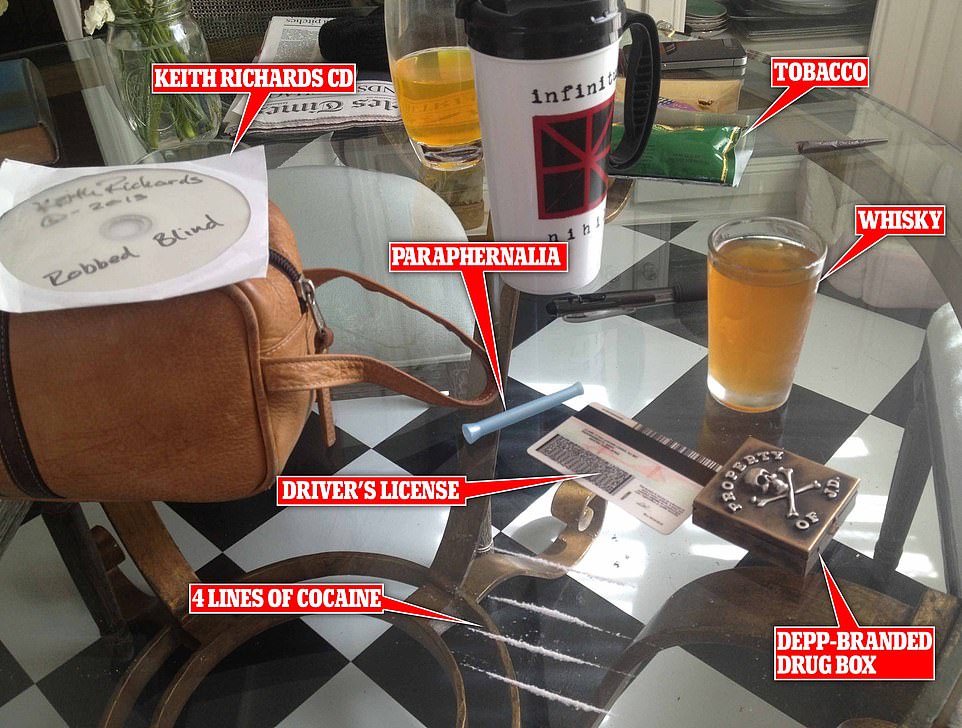 The High Court was yesterday shown photographs of Depp's drink and drug-filled lifestyle including an image taken by Heard that shows a pint of whisky, four lines of cocaine and his skull and crossbones 'pill box' ready for consumption at 1.37pm.