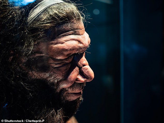 Neanderthals were a species that lived alongside humans tens of thousands of years ago and were very similar in appearance and size but were generally stockier and more muscular (Pictured: A replica of a male Neanderthal head in London's Natural History Museum)