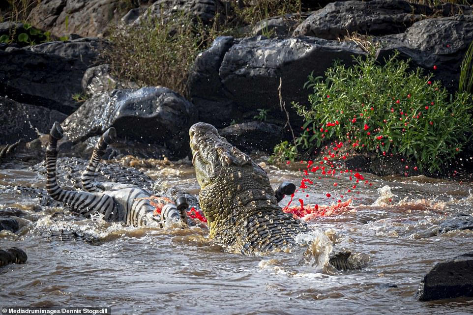 - The animal had been part of a herd which was cautiously crossing a river as crocodiles lurked beneath waterCrocodiles are well-known for their fearsome ability to catch and kill their prey.And this huge creature was no exception as it flipped an unfortunate zebra into the air with the force of its powerful jaws - before sending a fountain of blood into the air as it bit into it.The shocking scene was pictured in Kenya by financial consultant Dennis Stogsdill, 50, from Chappaqua, New York, during a trip to the Mara Triangle, part of the Maasai Mara National Reserve in the south of the country.