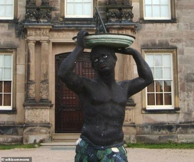 Pictured: A statue of a black man holding a dish on his head at Dunham Massey stately home in Altrincham