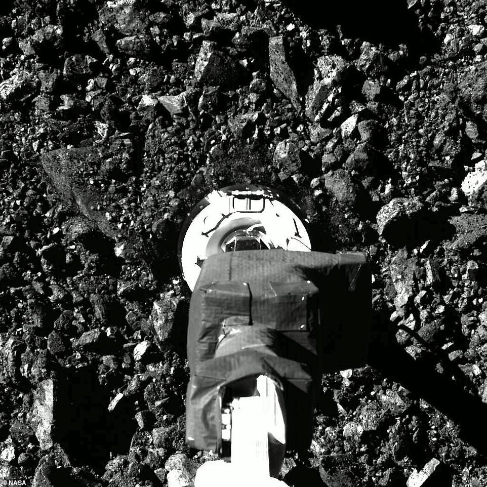 Touchdown! Stunning images taken from the historic OSIRIS-REx mission show the moment the spacecraft touched down on the asteroid Bennu more than 200 million miles away from Earth to collect a sample of dirt and dust Tuesday night. Above is the moment the spacecraft's 11-foot robotic arm made initial contact with the asteroid's surface and smashed some porous rock