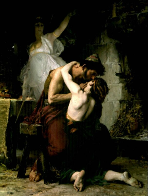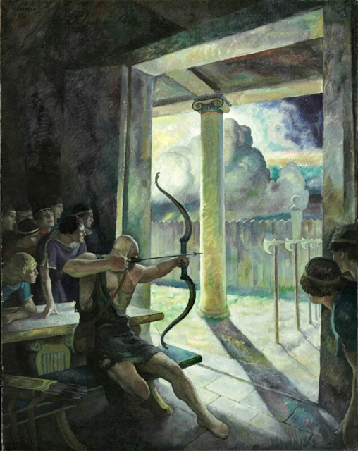 At the urging of Athena, Penelope decided to hold an archery contest to determine which suitor she would choose. Whichever man could shoot an arrow through twelve axe-heads would be the winner, and gain her hand in marriage. Odysseus was the only one who could complete the challenge, and having shot the arrow, he threw off his disguise, and together with Telemachus slaughtered the suitors. Convinced of his identity, Penelope “flew weeping to his side, flung her arms about his neck, and kissed him. Then Odysseus in his turn melted, and wept as he clasped his dear and faithful wife to his bosom.”