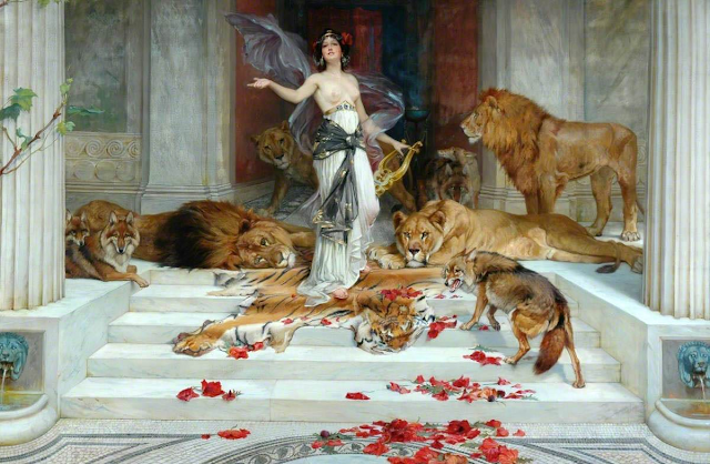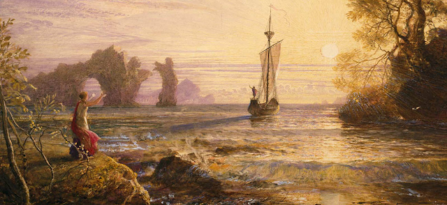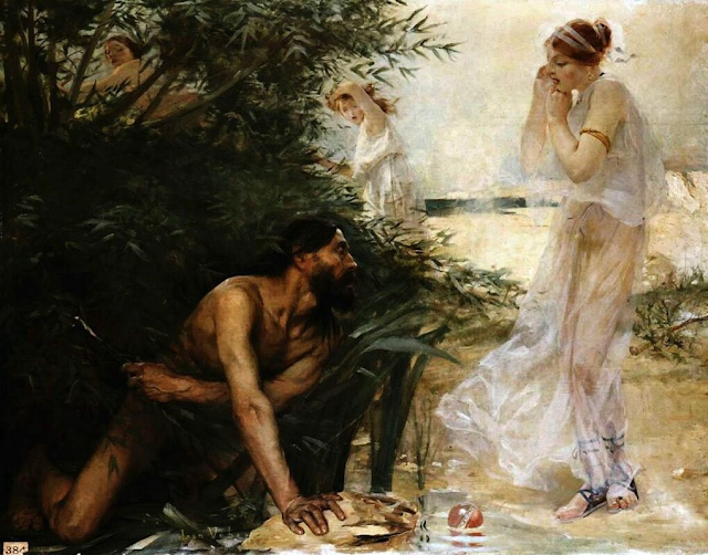 Calypso was a nymph goddess, daughter of the Titans. Finding Odysseus washed ashore, she took him in and cared for him, soon falling in love. Determined to have him as her husband, she kept Odysseus imprisoned on her island for seven years, promising him immortality if he would marry her. Yet Odysseus longed only for home and his wife Penelope, and finally the gods took pity on him. Zeus sent Hermes to command Calypso to release Odysseus, and she begrudgingly obliged. She helped Odysseus build a raft, but warned him that his hardships were not yet over.So it proved, for when he embarked on the raft, Poseidon spotted him, and sent a storm that tossed the raft about and broke it to pieces. Odysseus was left clinging to one plank of the raft. Poseidon retired to his palace, considering his work done, but Athena brought Odysseus safely to shore. He collapsed from exhaustion in the country of the Phaecians. The next morning the princess of that land, sporting with her handmaidens, found him and brought him to the palace.