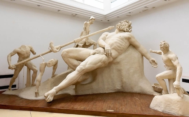 Polyphemus slept well that night, but Odysseus and his men cowered in fear throughout the night. They could not simply attack him as he slept, as they could not move the stone that blocked the entrance. The giant fed on two more men for breakfast, and after a day of tending his flocks in the fields, enjoyed another two for dinner. However, Odysseus managed to get him drunk, and he and four of his men drove a hot wooden spike into his eyes and blinded him.Polyphemus staggered to the entrance and drew back the stone, but waited by the mouth of the cave to catch Odysseus and his men. Odysseus, therefore, lashed together the thick-fleeced rams in groups of three. Each one of the surviving men clung underneath the middle sheep as they ran out of the cave. Safely out, Odysseus taunted Polyphemus. In his rage, the giant hurled bits of the mountain at the Greek ships, but they sped out away and escaped back to where they had left the other ships.
