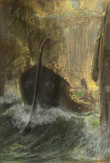 Past the Sirens, they faced Scylla and Charybdis, two mighty immortal monsters. Charybdis lay under the sea and sucked in ships as a whirlpool, while Scylla lay in wait among the rocks. As they desperately navigated around Charybdis, Scylla pounced from above. She carried off six men, who screamed and cried out to Odysseus as she hauled them away: “Even so did Scylla land these panting creatures on her rock and munch them up at the mouth of her den, while they screamed and stretched out their hands to me in their mortal agony. This was the most sickening sight that I saw throughout all my voyages.”