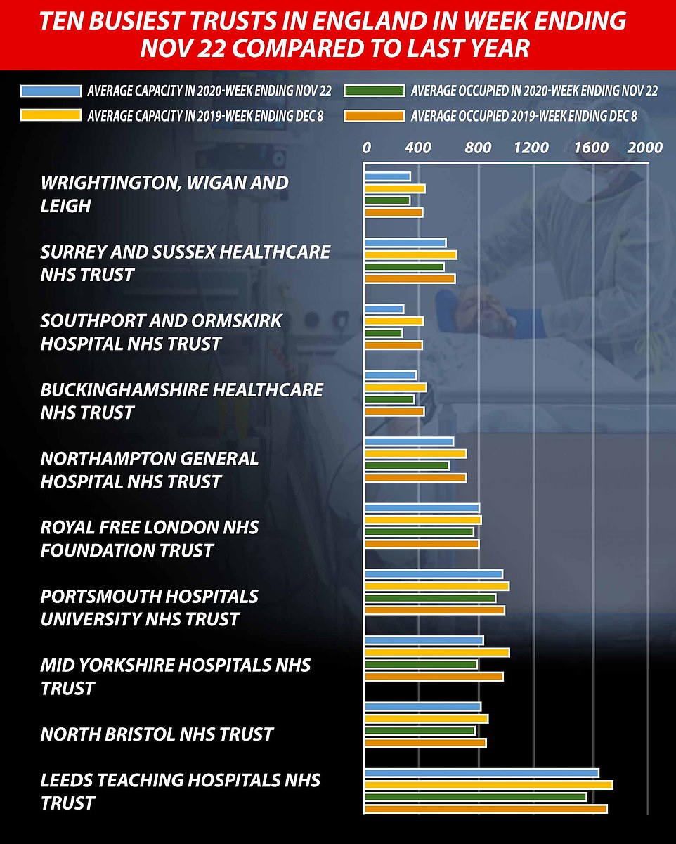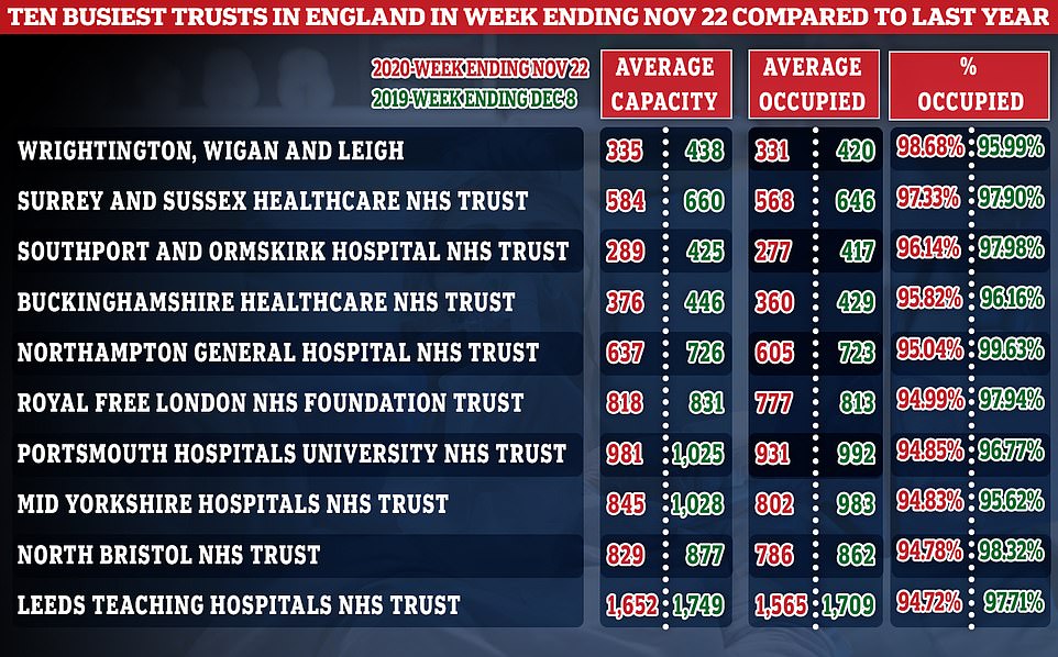 REGION - HOSPITAL TRUST - _ - AVERAGE CAPACITY - AVERAGE OCCUPANCY - % OCCUPANCY - _ - AVERAGE CAPACITY - AVERAGE OCCUPANCY - % OCCUPANCY - _ - BEDS OCCUPIED - _ - BEDS OCCUPIED - Experts said at the end of October that around 17.6 per cent of admissions in England caught the virus in hospital, and that regional variations saw it rise as high as 25 per cent in the North West.