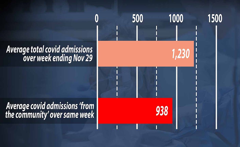 Government figures show there were 1,230 new coronavirus patients needing NHS treatment every day in England during the week ending November 29, on average. But only 938 of these - or 76 per cent - were admissions from 'the community', meaning they definitely caught the virus in their day-to-day life. It leaves question marks over how the other 292 patients who were admitted each day, on average, got infected because the NHS does not break down why they count as an admission