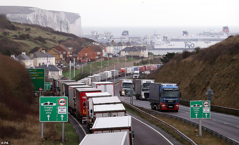 Lorries queue to enter The Port of Dover in Kent today as the clock ticks down on the chance for the UK to strike a Brexit deal