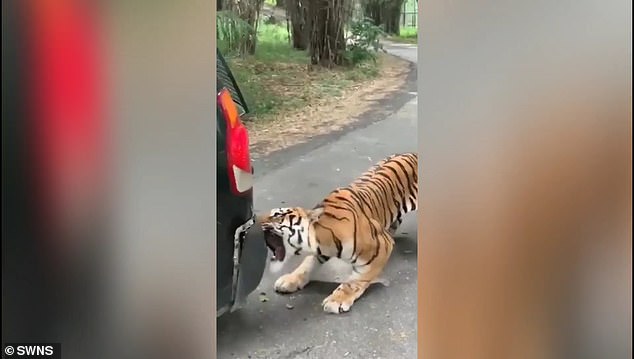 People in a neighbouring vehicle reacted with fascination as they watched the incredible feat.A man and woman were both heard yelling 'I'm scared,' after shutting their window in an attempt to protect themselves from the tiger - who seemed more concerned with the other vehicle's bumper.