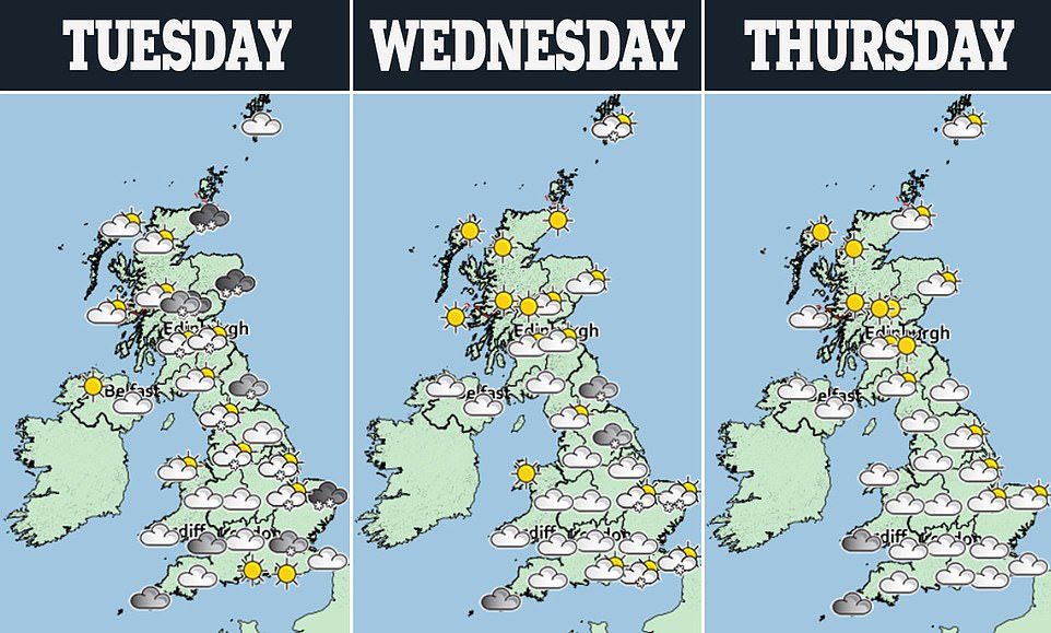 'Further west, we'll see some brighter skies and sunshine through the day but we will see more showers come in through the far north-east of Scotland on Thursday after another severe frost and bitter start to the day.'