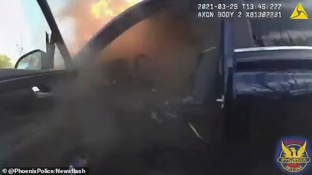 Bodycam footage recorded in the city of Phoenix, Arizona, shows the officer running towards the car, which has fierce flames burning on its front end.