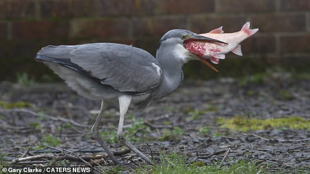 Gary, 47, said he heard a commotion and went out to investigate but 'couldn't believe his eyes' as the heron attempted to swallow the pet fish