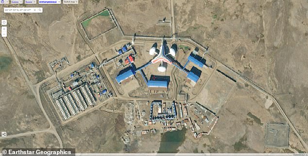 Satellite images appearing to show Russia beefing up its military presence in the Arctic have emerged. Pictured: One of many 'trefoil bases' with a three-pronged building on an airfield in Nagurskoy, Alexandra Land in Arkhangelsk Oblast, Russia