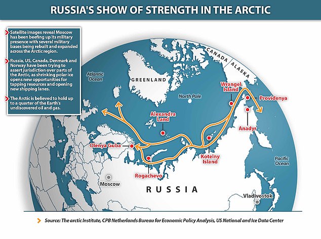 Russia has been improving aircraft runways and their bases across the Arctic - such as at the Nagurskoye Air Base (pictured)