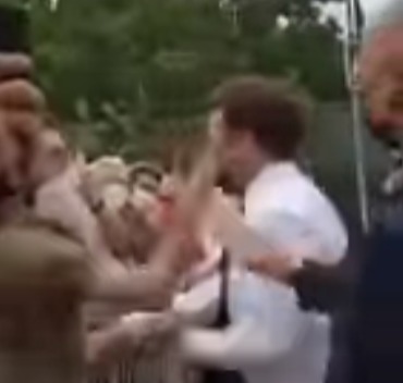 The crowd erupted as Macron's security entourage quickly pulled him away from the fence where he was greeting the voters.