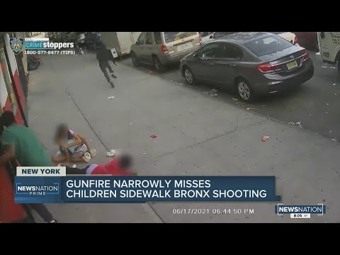 The video shows one man shoot at a 24-year-old male multiple times in front of a Bronx bodega about 6:45 p.m. Thursday while the terrified children dive for cover. The children were a 5-year-old boy and 10-year-old girl.