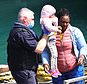 One man wearing shorts had his left leg amputated and required crutches to make his way up the gangway.