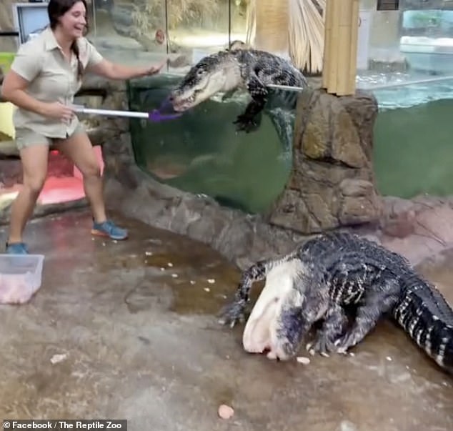 But things did not go to plan as Darth Gator, an 8.5ft-long alligator weighing more than 200lbs, made a break for freedom after she opened the enclosure door.