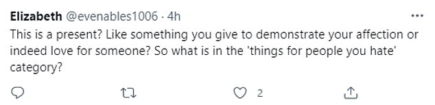 'This is a present?' questioned one. 'Like something you give to demonstrate your affection or indeed love for someone? So what is in the 'things for people you hate' category?'