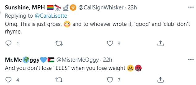 'Ermm. Wow. I'm gobsmacked tbh,' wrote one, while a second penned: 'OMG. This is just gross and to whoever wrote it, "good and club" don't rhyme.'