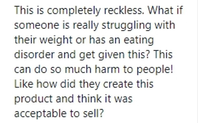 'This is completely reckless. What if someone is really struggling with their weight or has an eating disorder and get given this? This can do so much harm to people! Like how did they create this product and think it was acceptable to sell?'