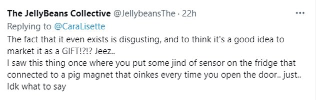 Another added: 'The fact that it even exists is disgusting, and to think it's a good idea to market it as a GIFT!?!? Jeez.. I saw this thing once where you put some kind of sensor on the fridge that connected to a pig magnet that oinks every time you open the door.. just.. Idk what to say.'