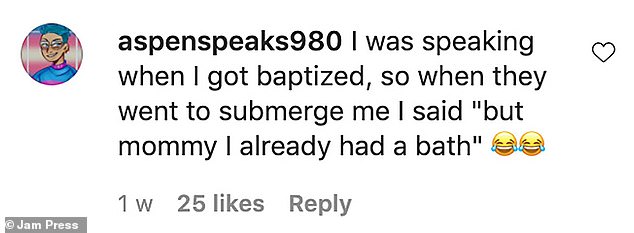 Someone else quipped: 'Baby was just baptising back.'