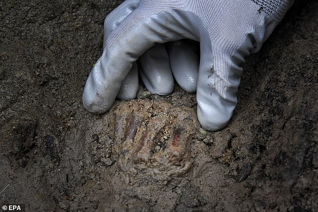 Skeletal remains of man who died a horrific death during the catastrophic Mount Vesuvius eruption in 79AD have been unearthed in what was once the city of Herculaneum. Pictured is part of the man's hand sticking up through the ground