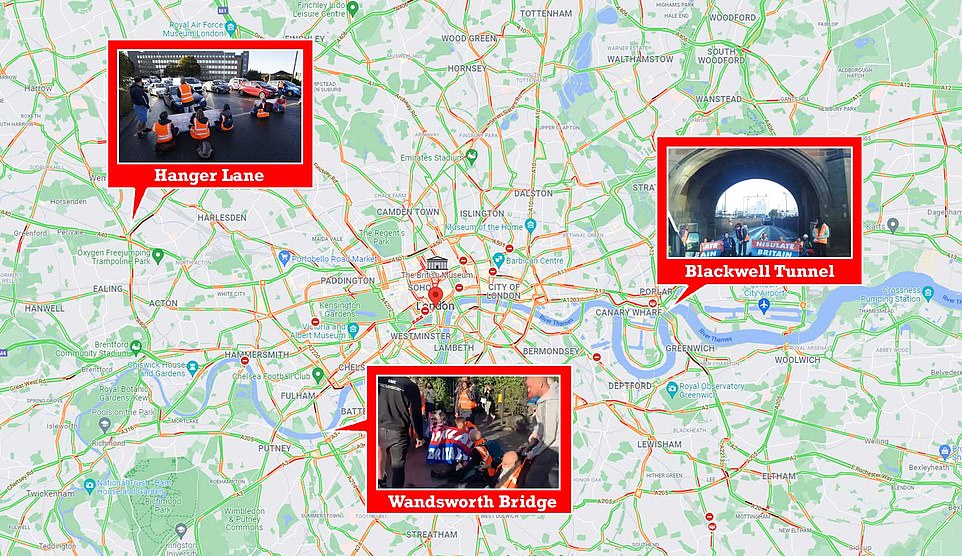 The chilling exchange comes after a tearful woman trying to get to her unwell 81-year-old mother in a Canterbury hospital slammed 'selfish' eco-morons who had blocked the Blackwall Tunnel, Hanger Lane and Wandsworth Bridge between 8am and 12pm.