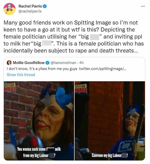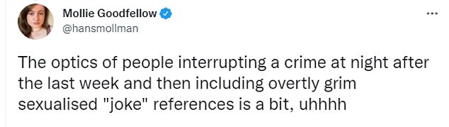 TV writer Mollie Goodfellow, who shared the Spitting Image clip, tweeted: 'The optics of people interrupting a crime at night after the last week and then including overtly grim sexualised "joke" references is a bit, uhhhh'.