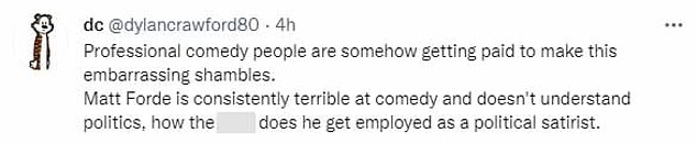 'Matt Forde is consistently terrible at comedy and doesn't understand politics, how the f*** does he get employed as a political satirist.'
