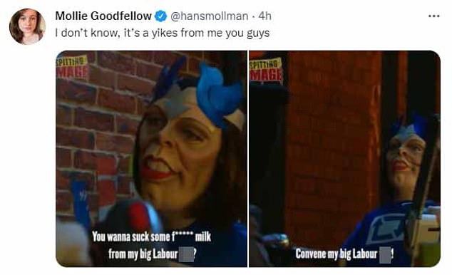 Telling the 'adult man' he 'should not be riding a scooter like a baby', her character adds: 'You wanna suck some f***ing milk from my big Labour t*ts?'
