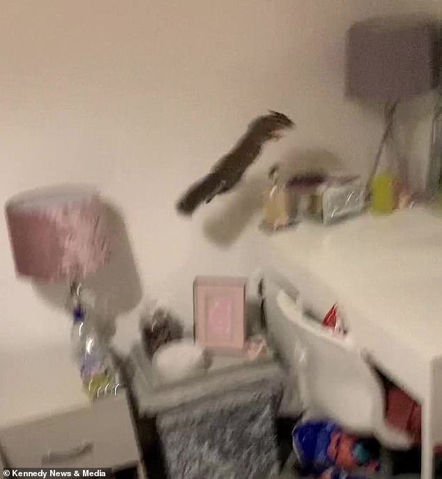 Squirrel nutjob! Moment mother and daughter scream in terror as trapped rodent bounces off bedroom walls towards them