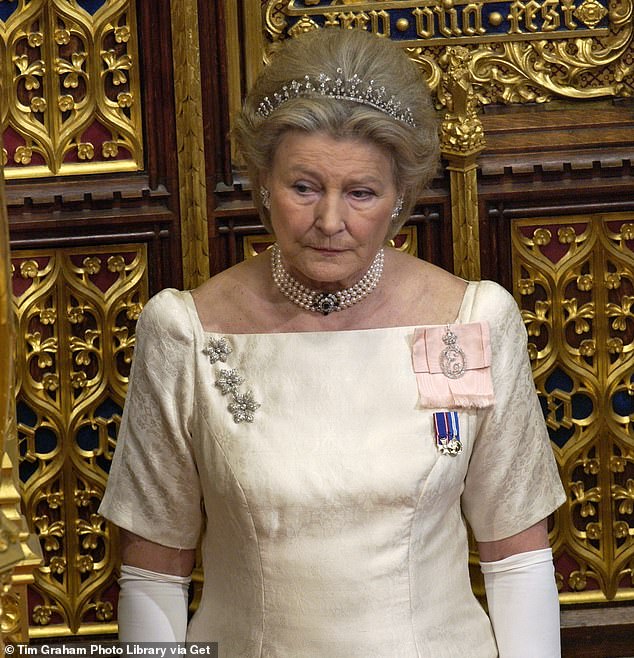 The Queen's longstanding Lady-in-Waiting Diana, Lady Farnham pictured accompanying the monarch during the State opening of Parliament in the House of Lords
