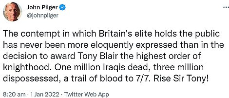 Another said: 'The contempt in which Britain's elite holds the public has never been more eloquently expressed than in the decision to award Tony Blair the highest order of knighthood. One million Iraqis dead, three million dispossessed, a trail of blood to 7/7. Rise Sir Tony!'