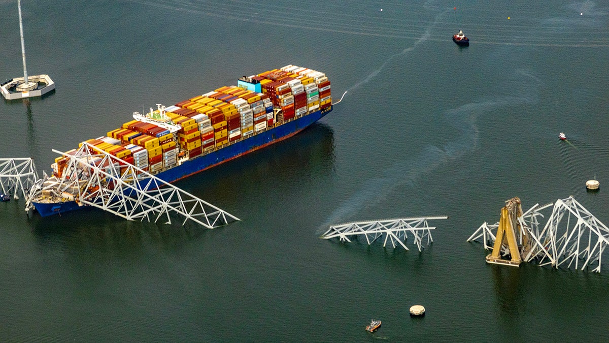 In an aerial view, the cargo ship Dali sits in the water after running into and collapsing the Francis Scott Key Bridge on March 26, 2024, in Baltimore, Maryland. (Tasos Katopodis/Getty Images)