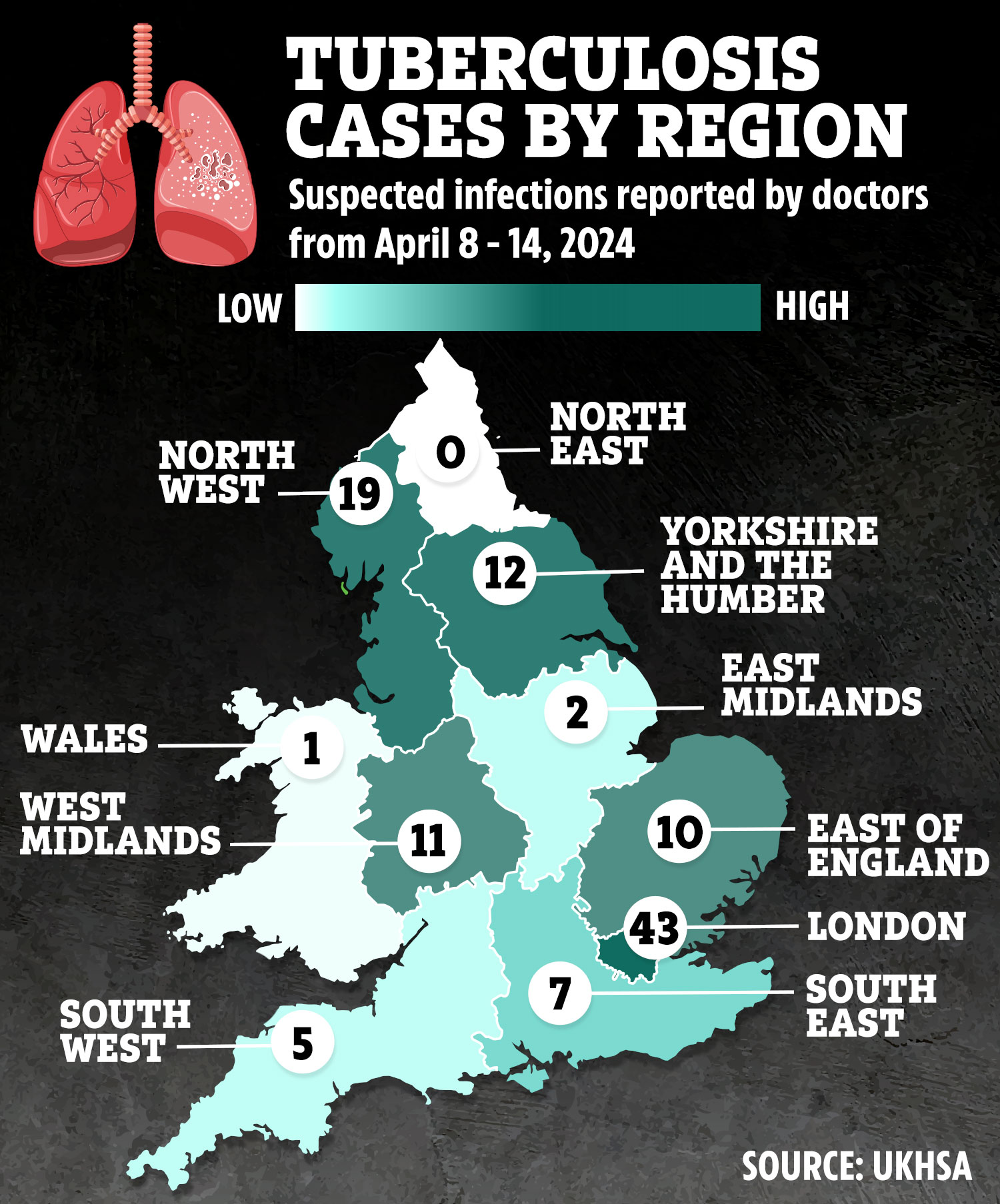 After the capital, the North West came in second as the area where you're most likely to pick up TB, with doctors in the region having reported 19 suspected cases.