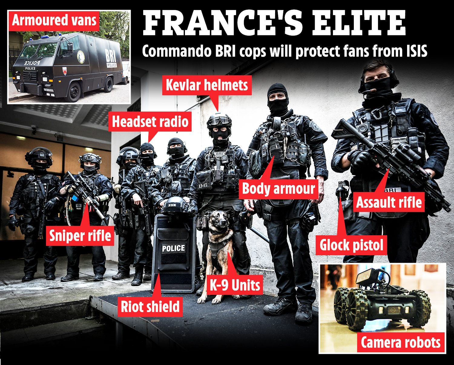 The deployment of the fearsome Research and Intervention Brigade (BRI) showed how seriously France was taking ISIS' threats on their stadium.